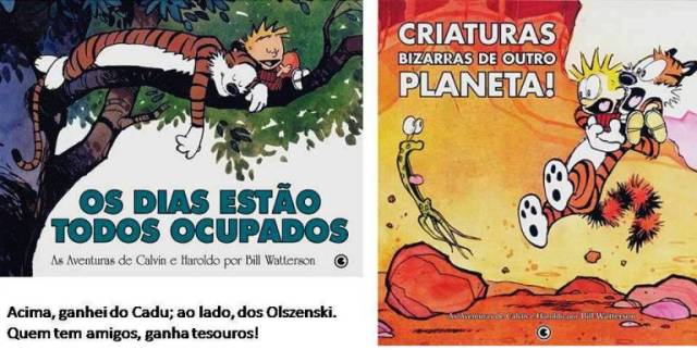Ganhei dois livros do Calvin no meu recente natalício. Um veio do Cadu Blanco; o outro, do casal Olszenski (que nome chic esse!) Claudia e Victor. É lamentável saber que há pessoas que desconhecem Calvin e seu urso Haroldo (Calvin and Hobbes), criação do genial Bill Watterson. Para evitar lamentações, vamos apresentar a dupla:
