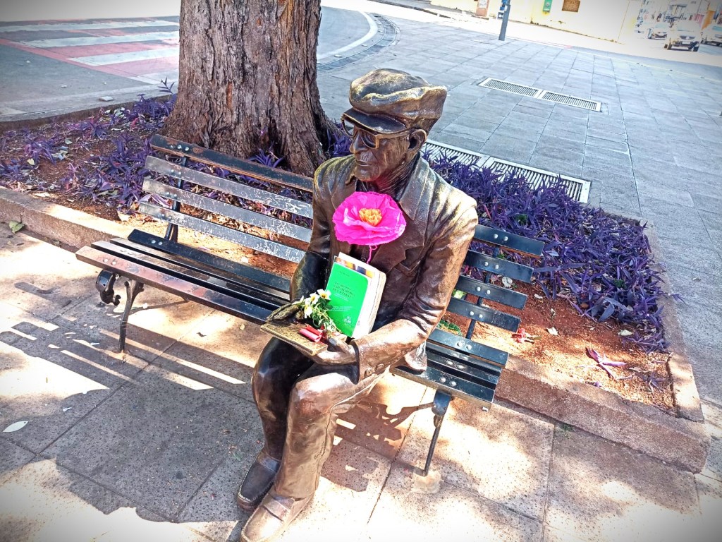 Passo por Chico Xavier, cuja escultura aparenta ser como as tantas que há por aí, as cidades homenageando pessoas ilustres. O médium está sentado no lado esquerdo do banco, usando paletó e boné, calças e sapatos simples. No colo, sobre as pernas unidas segura um livro transformado em suporte para livros reais, flores murchas e uma enorme, artificial. Na capa do livro que está na frente lê-se o título: O caso dos exploradores de cavernas. Não guardei o nome do autor e, registrando o momento em foto, não consigo decifrar o sujeito. Com certeza, não é da autoria de Chico.