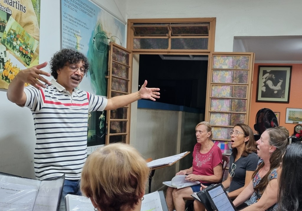 Normalmente, eu a tranquilizaria enquanto desfilaria o rosário cotidiano: Sempre se começa com um certo atraso. Decorre da dificuldade de confundirmos hora de chegada com hora para começar. E há faltas! Por doença, por trabalho ou por outra razão justificada. Alguns estudam em casa, outros não. Uns já levam as partituras previamente impressas, outros esperam as cópias lá na hora mesmo. Há barulhos, “percussão involuntária”, e logo após o “tenha paciência” de minha mãe, eu continuaria em defesa própria e dos colegas. Amamos cantar! A vida com música é infinitamente melhor!