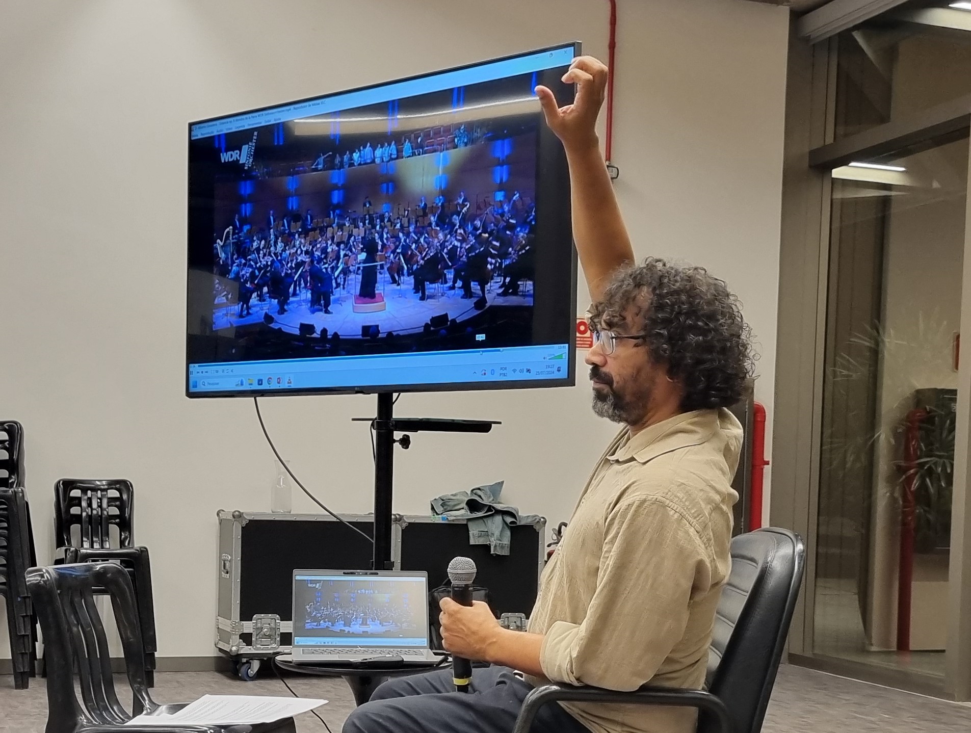 Solene e compenetrado, como convêm ao cargo, nosso maestro nos encara com confiança durante toda a apresentação. Um alívio! A máxima do “roupa suja se lava em casa” assume total preponderância. Atento e catalisando a atenção do grupo ele conduz cada canção e é ao final, ainda de costas para o público, que penso já distinguir os sorrisos do maestro. Há aquele do dever cumprido, outro de alívio pela peça difícil executada com dignidade. Um bem especial é pela reação do público. Se aplaudem antes do final, há aquele sorriso tipo “somos fodas!”. O melhor de todos é um raro, bem mais raro do que eu gostaria, que se manifesta quando nós, o coro, fazemos tudo certo e bonito. Mais que eficientes, é aquele momento em que fazemos arte. Fica ali, sem que a plateia veja, um leve sorriso do maestro.