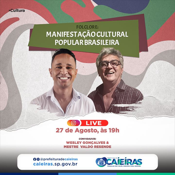 Na próxima sexta, 19h00 participarei do encerramento da Semana Cultural organizada pela Secretaria de Cultura de Caieiras. O tema, Folclore em diferentes manifestações culturais brasileiras, será apresentado em live com o Secretário de Cultura Wesley Gonçalves que me honra com esse convite e a quem, desde já, agradeço.