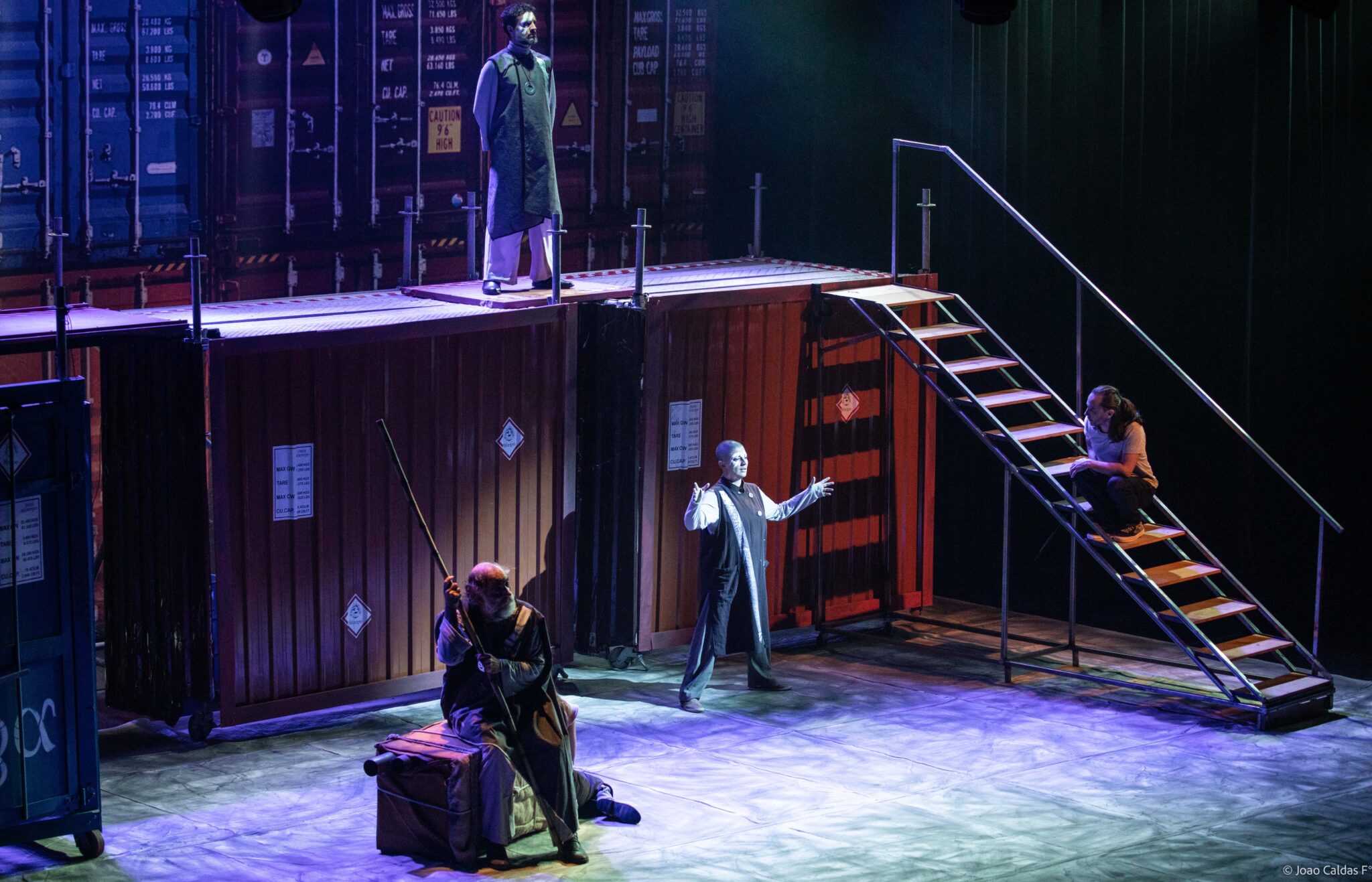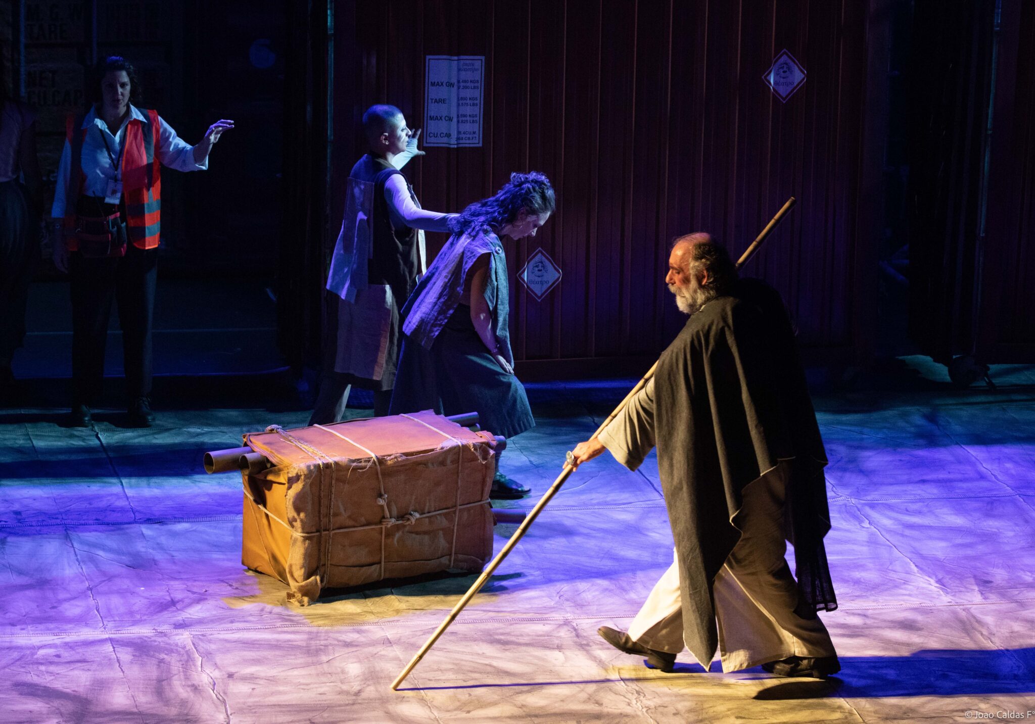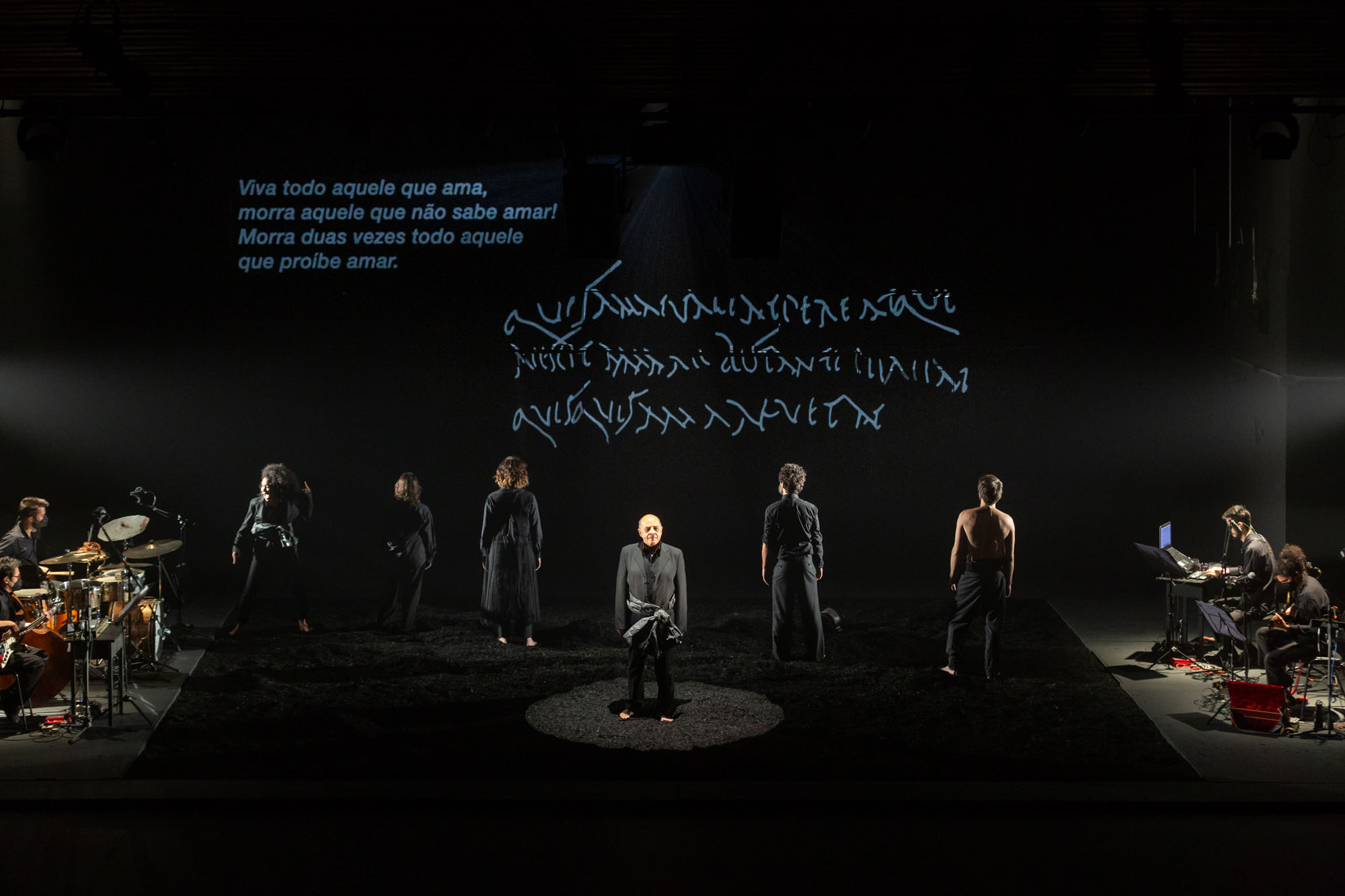 “Seis atuantes e quatro músicos dão a ver e ouvir a epopeia dos povos que formaram o português falado no Brasil, seus mitos e cosmogonias, passando pelas remotas origens ibéricas, por romanos, bárbaros e árabes, pela África e a América Nativa.