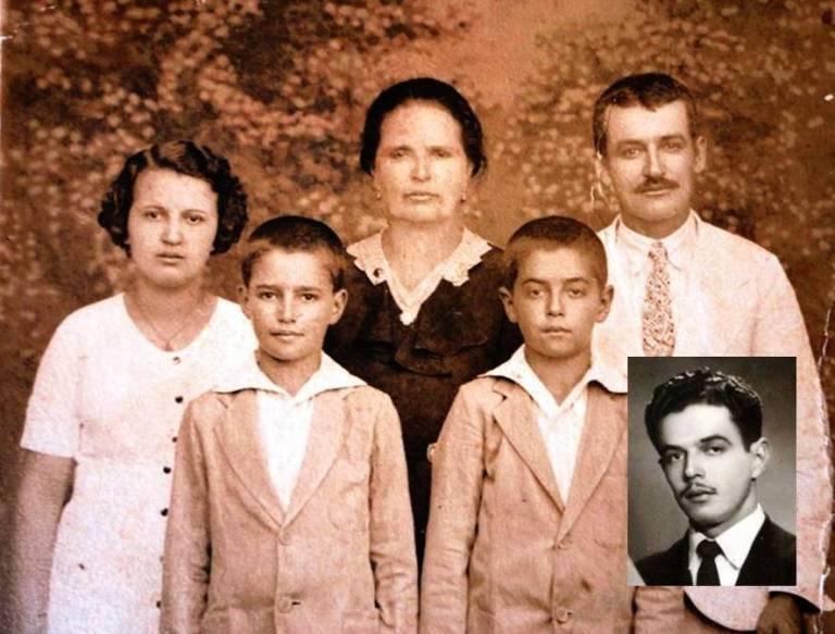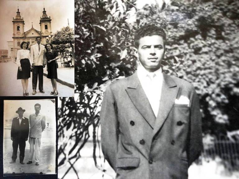 Papai foi um menino – o da direita – que veio a se tornar o rapaz da foto sobreposta. Meu avô, Deolino, casou-se pela segunda vez com essa simpática Maria. Minha avó trouxe outros filhos do primeiro casamento. Papai foi caçula de uma família moldada nos velhos hábitos mineiros. Nasceu em Estrela do Sul (20/02/1924), mas mudou-se muito cedo para Araguari, ambas as cidades do Triangulo Mineiro. Saiu de lá casado e perambulou um pouco até fixar residência em Uberaba, onde faleceu em 21/05/2005.