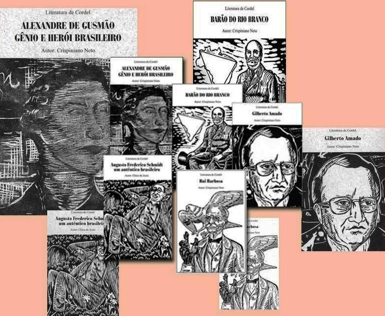 Fui presenteado com cinco biografias. Uma do cordelista Chico de Assis, “Augusto Frederico Shmidt – um autêntico brasileiro”. As quatro restantes de Crispiniano Neto: “Rui Barbosa”, “Alexandre de Gusmão, Gênio e Herói Brasileiro”, “Barão do Rio Branco” e “Gilberto Amado”. Para quem conhece um pouquinho sobre essas personalidades históricas brasileiras, sabe que elas estão ligadas ao universo da diplomacia nacional. Daí não estranhar que esses folhetos tenham sido publicados pela Fundação Alexandre de Gusmão que é ligada ao Ministério das Relações Exteriores.