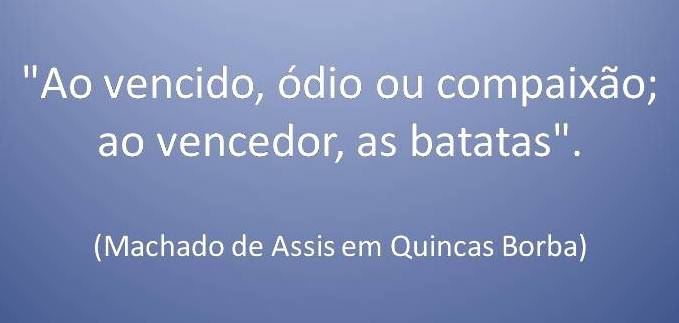 A expressão “Ao vencedor as batatas” tem origem, é bom lembrar, em Machado de Assis, no romance “Quincas Borba”. Surge no exemplo do filósofo Quincas como conclusão da história de duas tribos, famintas ante um campo de batatas que entram em guerra, já que as batatas são suficientes apenas para uma delas. A tribo vencedora, renovando as energias com as tais batatas, poderá ir além, percorrer o caminho até chegar a um campo onde há grande quantidade de… Batatas. Simplificando: os vencedores podem desfrutar das batatas.