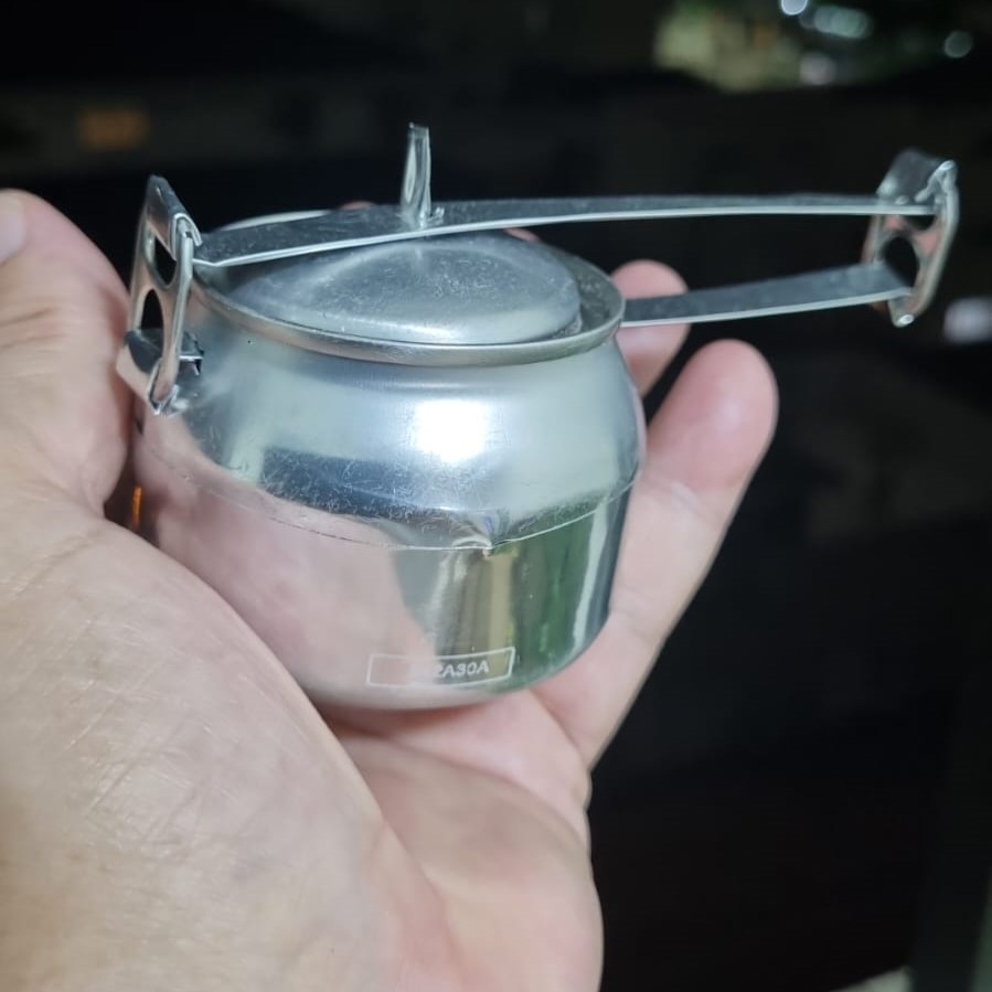 Sem parar de falar, Wanderlei pegou uma latinha dessas que são vendidas aos montes em quiosques e barracas. Primeiro, com a ajuda de um canivete, tirou o adesivo que cobria a lata, deixando visível o alumínio, ou material que o valha. Sob nossos olhos, pegou uma tesoura, cortou aqui e ali, e aprontou a base do que pretendia. Outra lata, para utilizar partes específicas, e repetindo os procedimentos concluiu a panela, “Uma panela de pressão!”, apresentou ao final, orgulhoso.