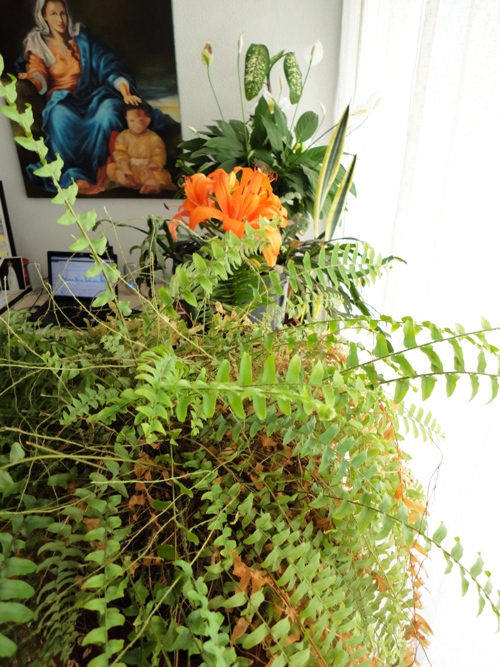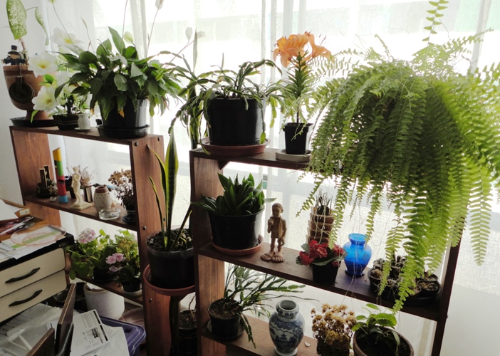 Insisto sempre em que todas as pessoas deveriam ter umas plantinhas dentro de casa, nas soleiras das janelas, criando jardins internos ou aéreos, como o do topo do edifício bem em frente ao que eu moro. Nunca é o bastante aproveitar todo e qualquer espaço para uma plantinha. Só de olhar pro verde a impressão é de conforto, frescor. O verde na cabeça lembra o mato, para a zona rural de onde todos nós, mesmo que remotamente, viemos.